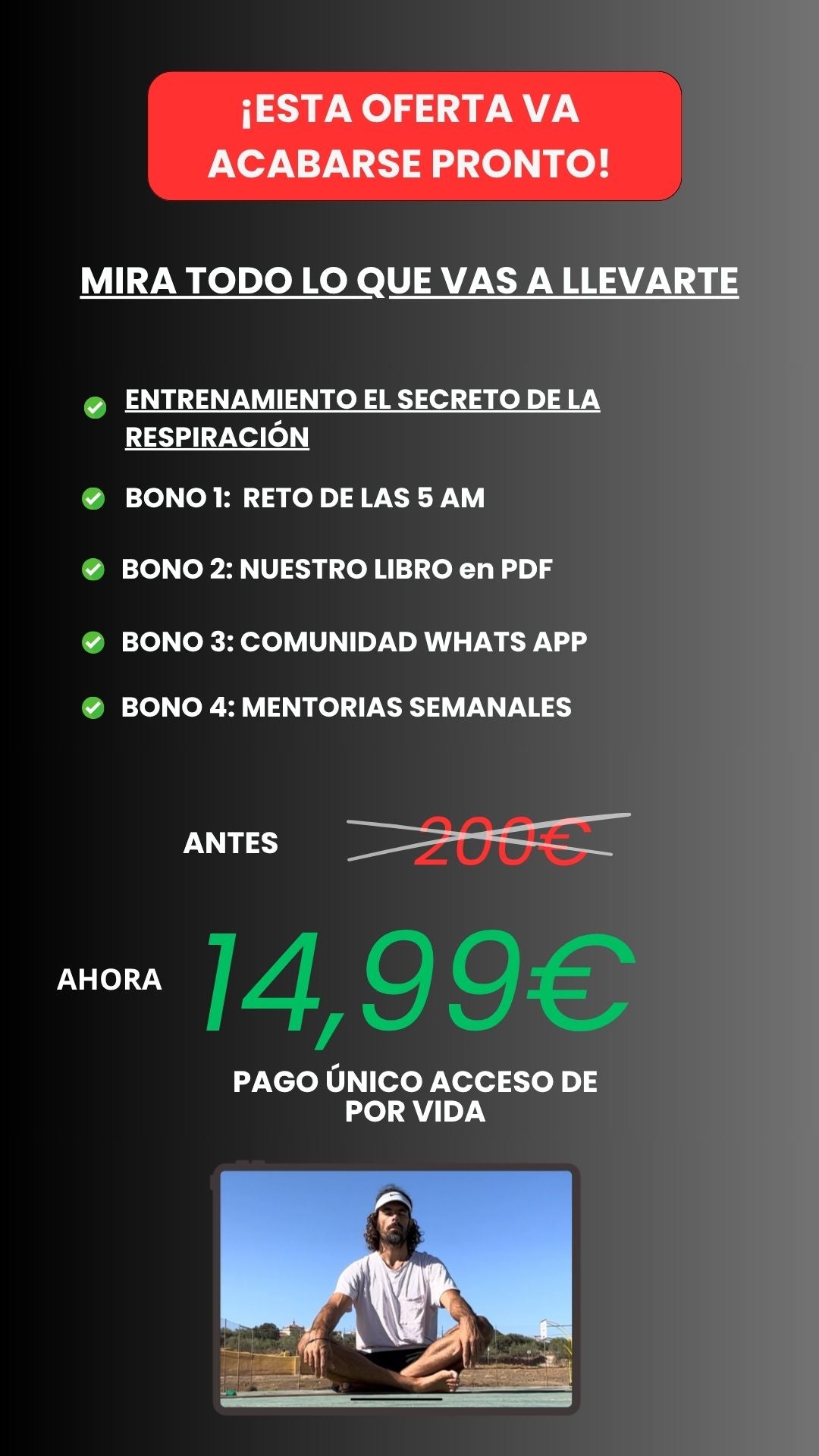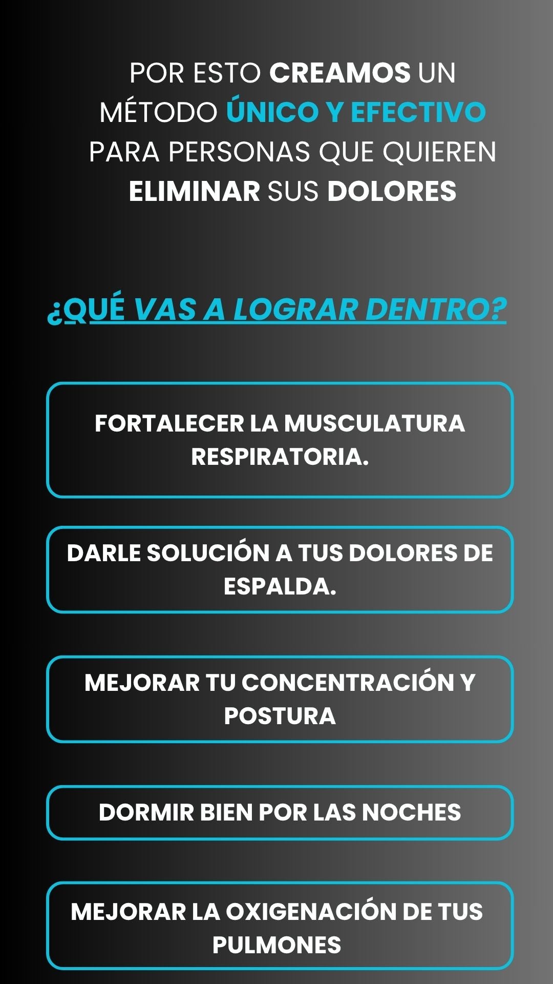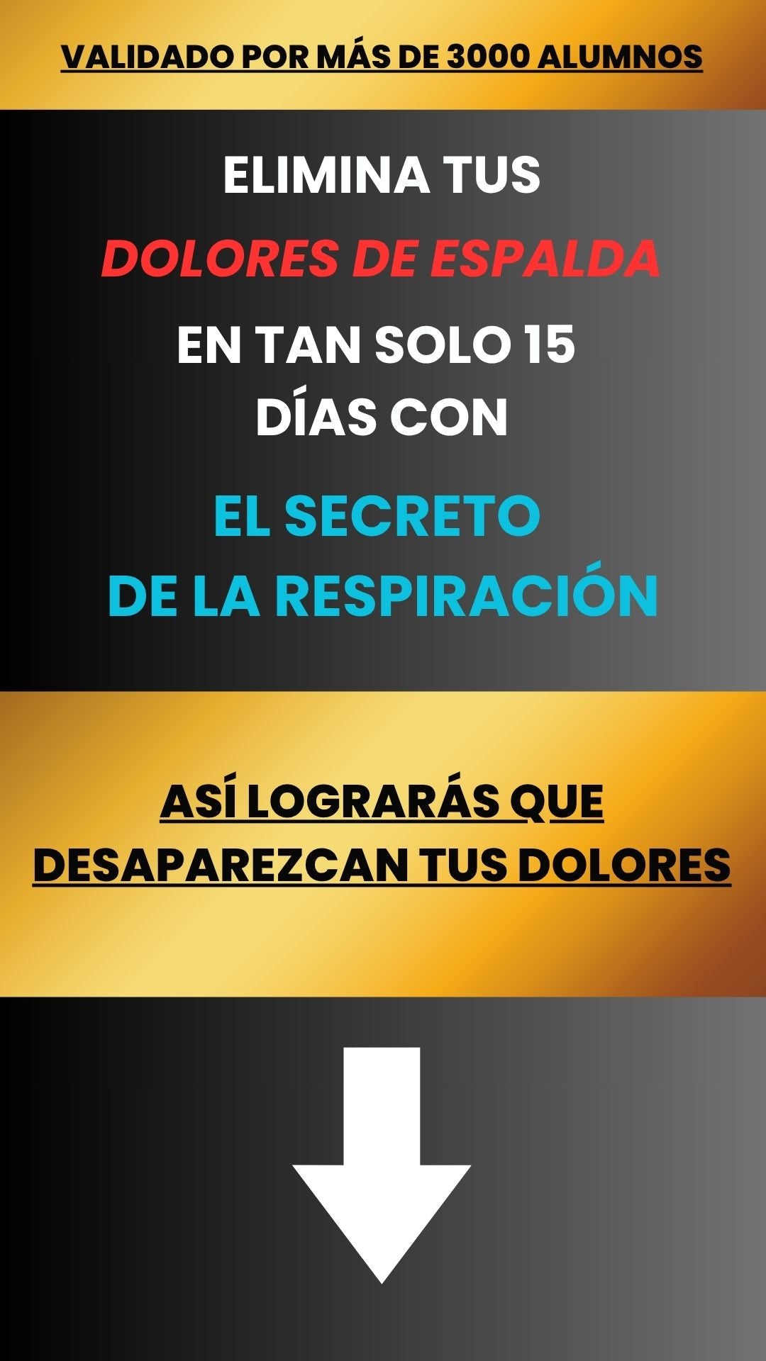 Es un programa DE ENTRENAMIENTO fácil y guiado paso a paso que te enseña técnicas de respiración conscientes para eliminar tus dolores de espalda , contracturas y fatiga crónica.