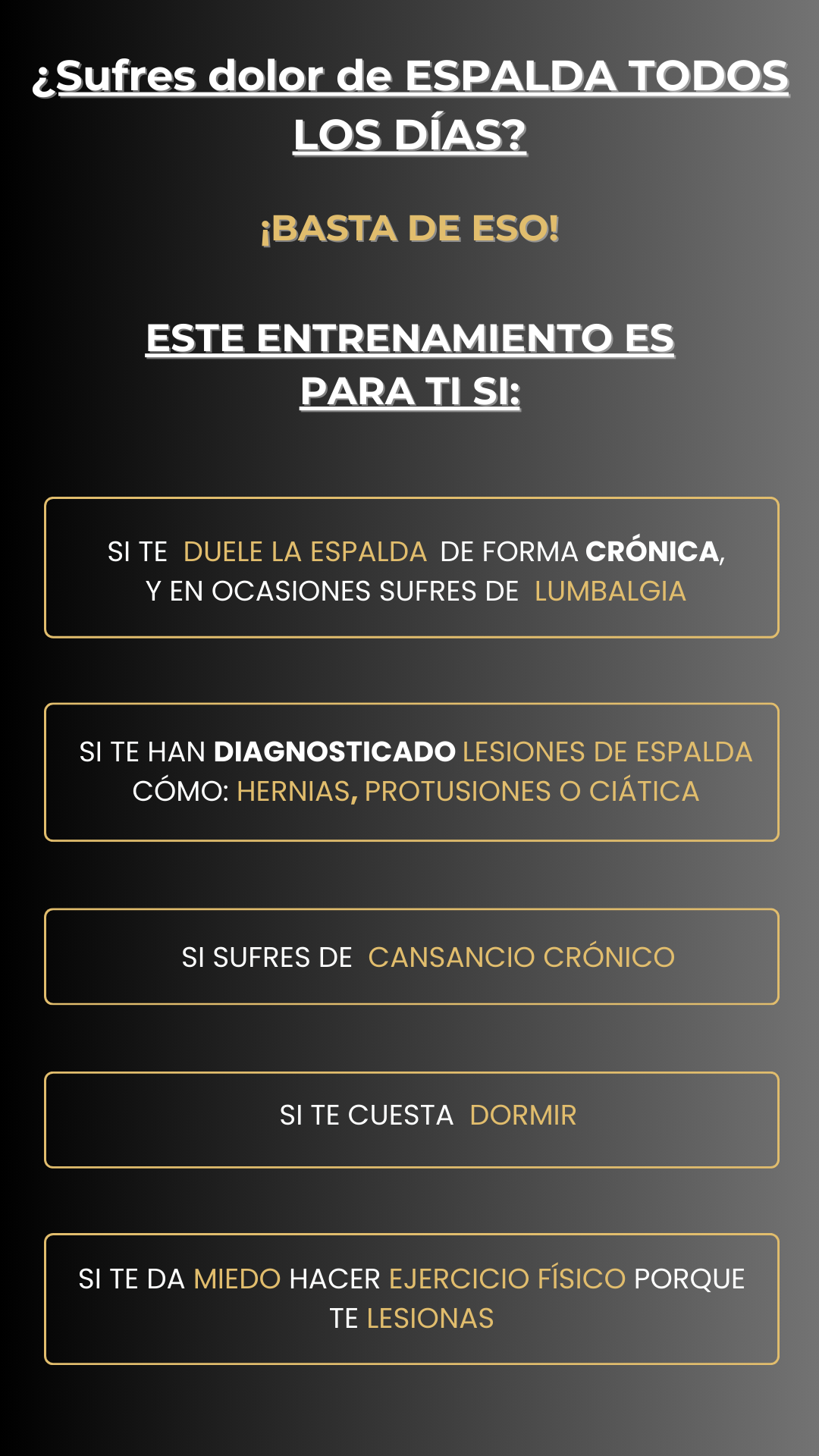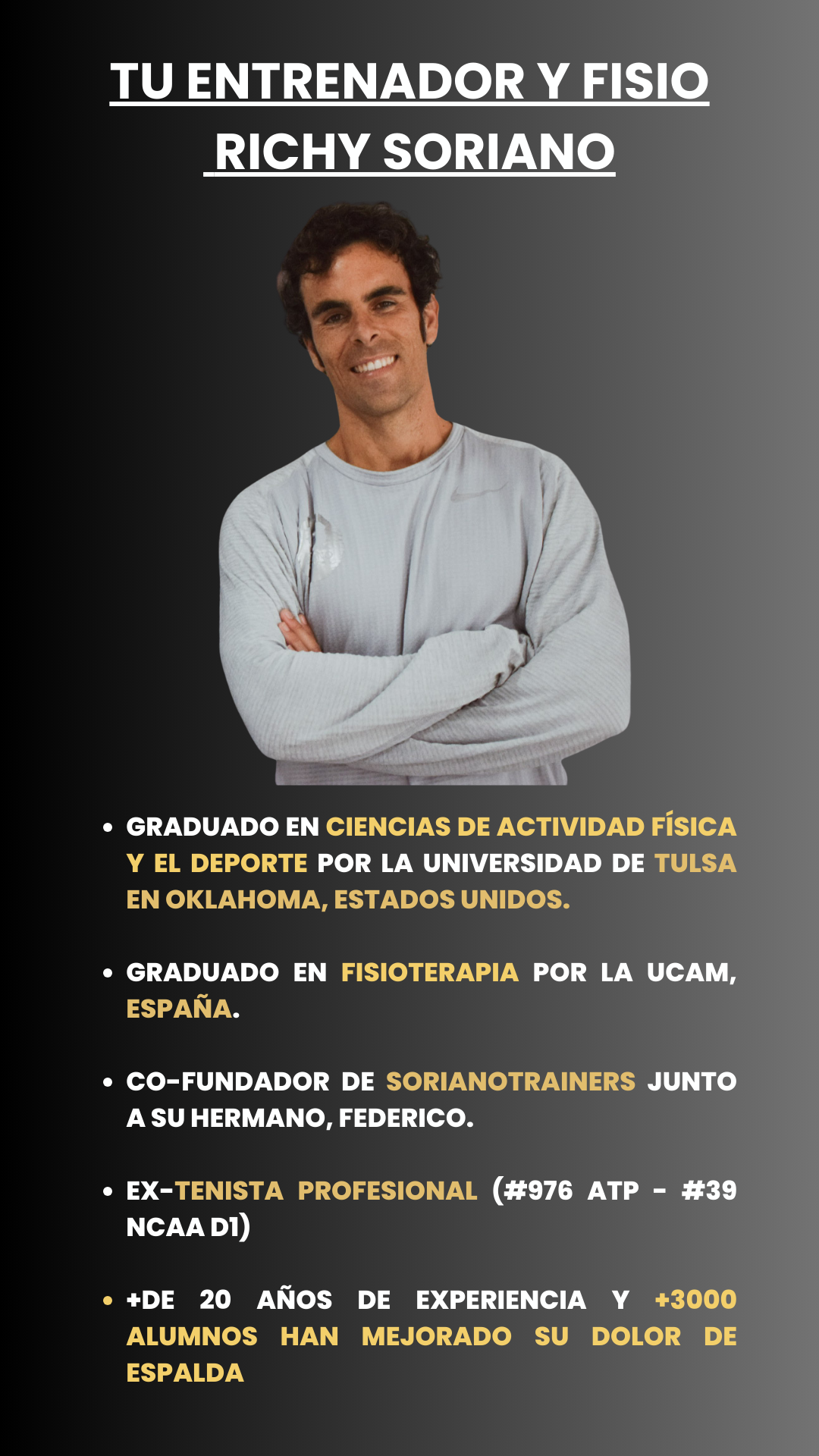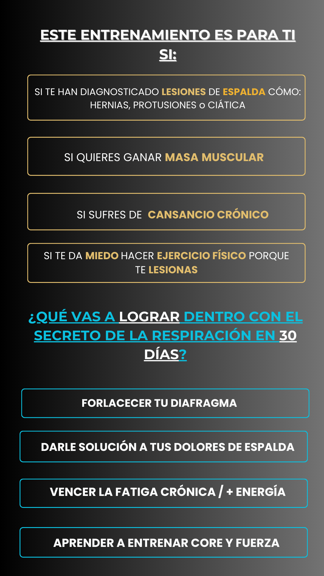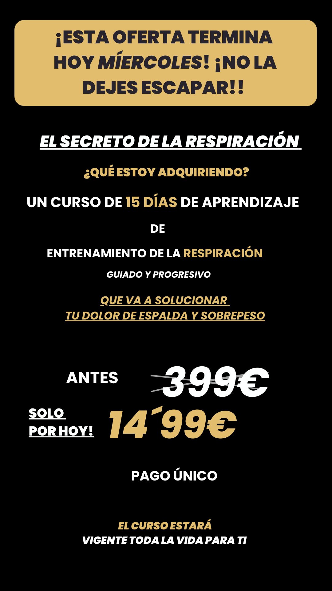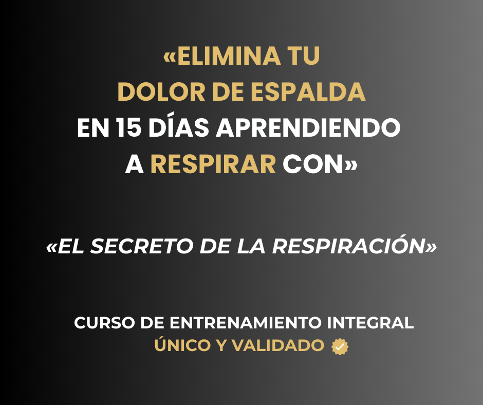 Es un programa DE ENTRENAMIENTO fácil y guiado paso a paso que te enseña técnicas de respiración conscientes para eliminar tus dolores de espalda , contracturas y fatiga crónica.